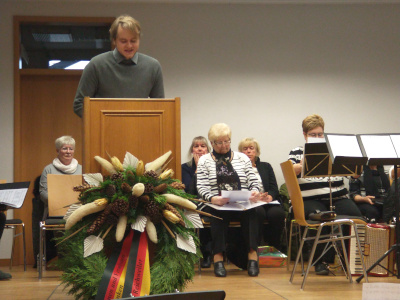 Zitat vom Bürgermeister: "Heute gedenken wir nicht nur die gefallenen Soldaten, sondern auch der Zahllosen Zivilisten, Frauen und Männer, Kinder und Ältere, die Opfer von Gewalt und Krieg wurden."