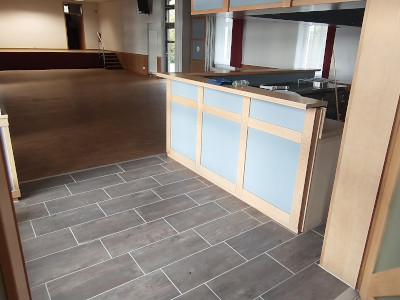 Im Thekenbereich ist das Parket jetzt durch Fliesen mit Holzoptik ersetzt worden.